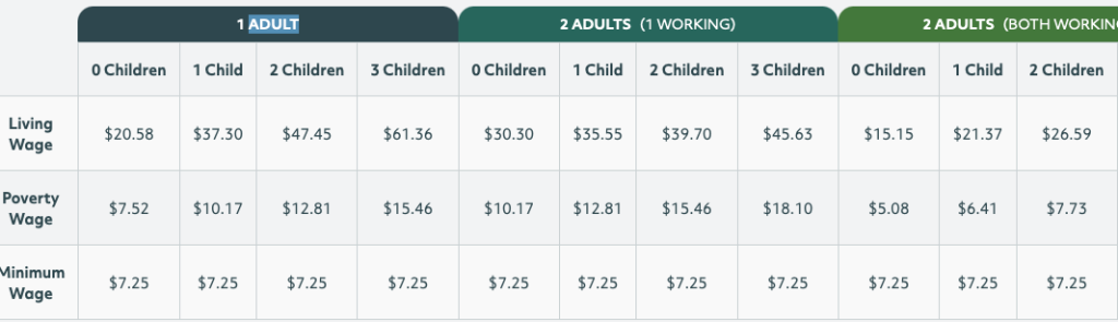 The Massachusetts Institute of Technology hosts a living wage calculator. Here is how the researchers frame their tool: “The living wage shown is the hourly rate that an individual in a household must earn to support themselves and/or their family, working full-time, or 2080 hours per year. The tables above provide living wage estimates for individuals and households with one or two working adults and zero to three children. In households with two working adults, all hourly values reflect what one working adult requires to earn to meet their families’ basic needs, assuming the other adult also earns the same.”